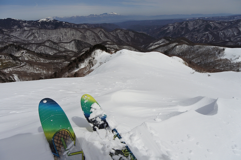 前日の大雪が気温の上昇と共にシールに張り付き、ラッセルしながら急斜面を登る。三峰山の斜面は雪質も良好で真っ白な斜面を気持ち良く滑る事が出来た。 |