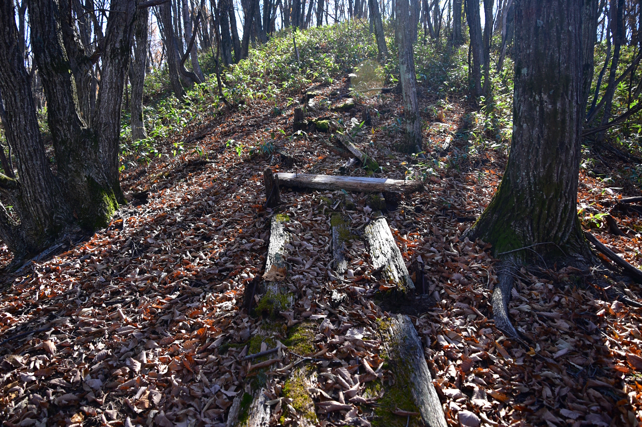 国土地理院の地形図には登山道が掲載されていたが、ほぼ廃道となっていて、GPSで確認しながら鍋蓋山に登った。 |