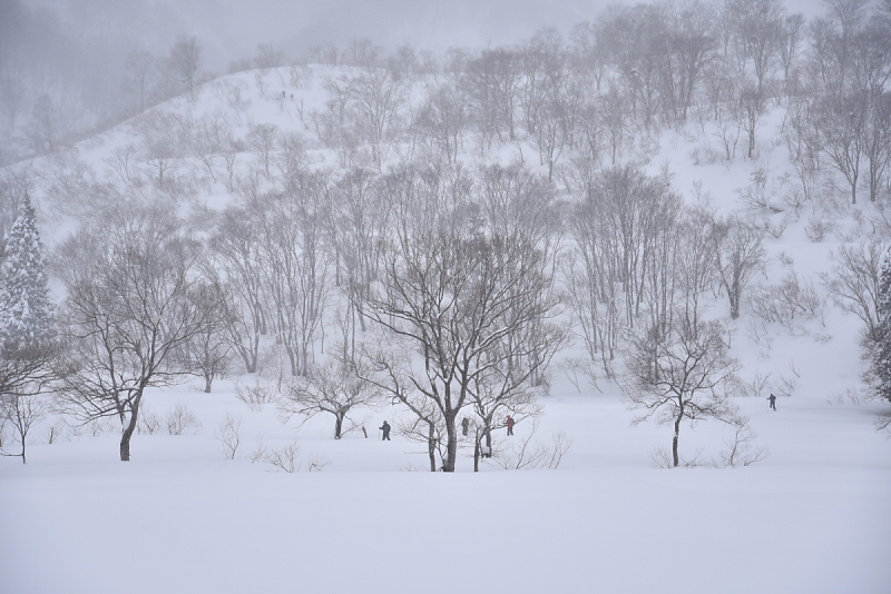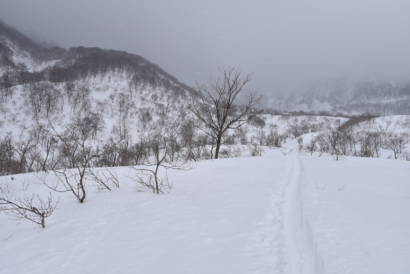 トレースを追いながら山頂を目指しましたが、1m以上の新雪は進むのも大変で、下山の事も考えて途中で引き返しました。 |