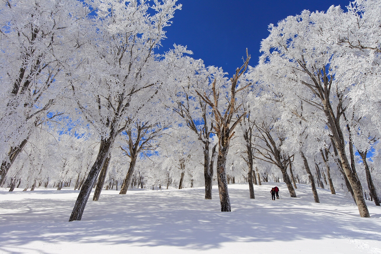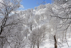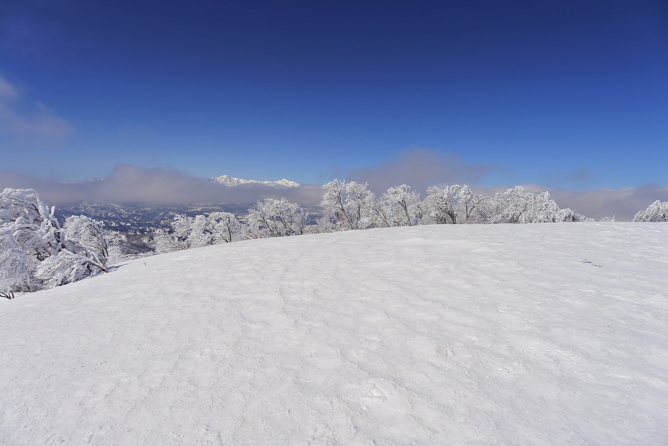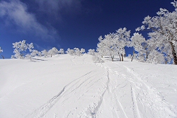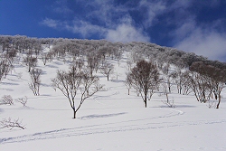 僅かですが新雪がありました。霧氷も素晴らしく急いで登って景色を堪能。雪がダメになる前に、いつもの場所を滑り降りました。