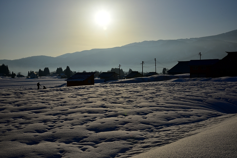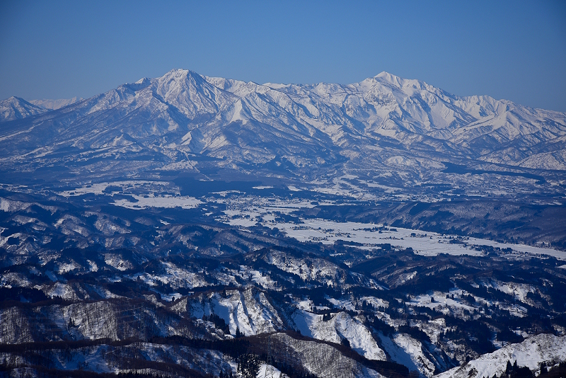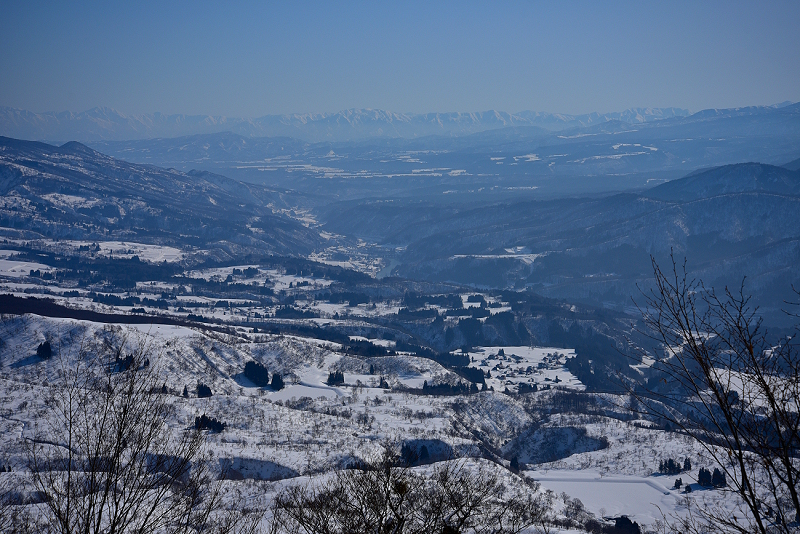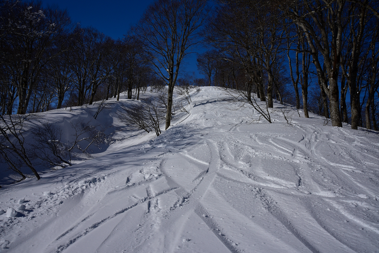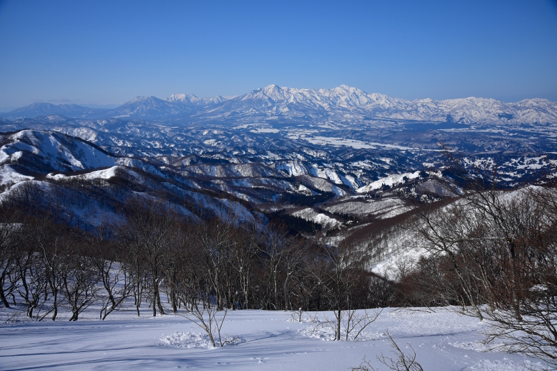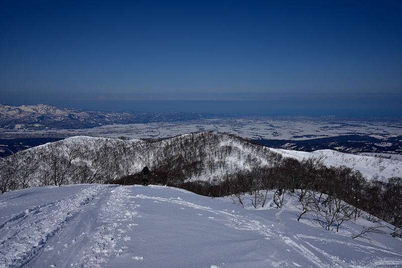 日本海もバッチリ見えました。雪質が良さそうな場所を狙って滑り下りましたが、どこを滑っても残念な雪質でした。