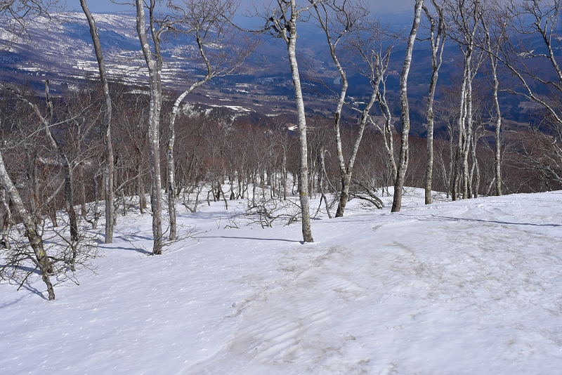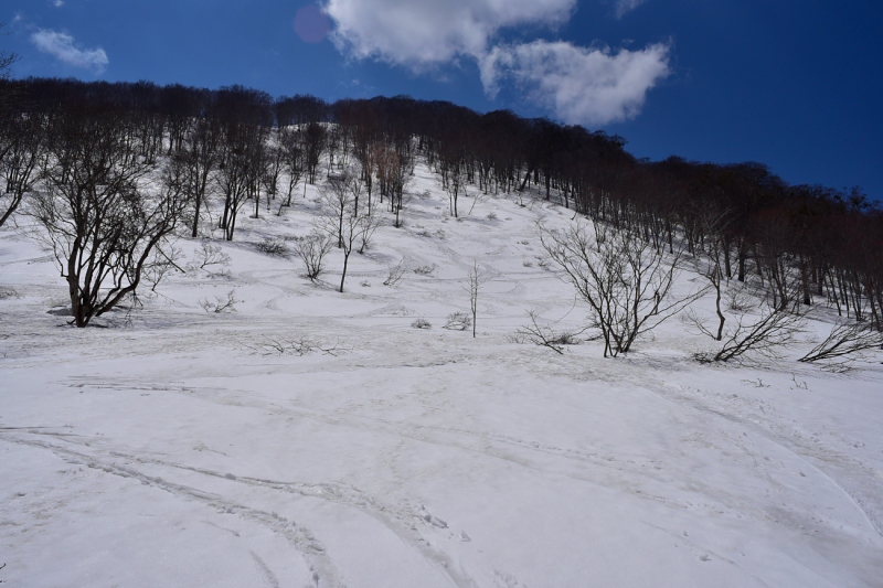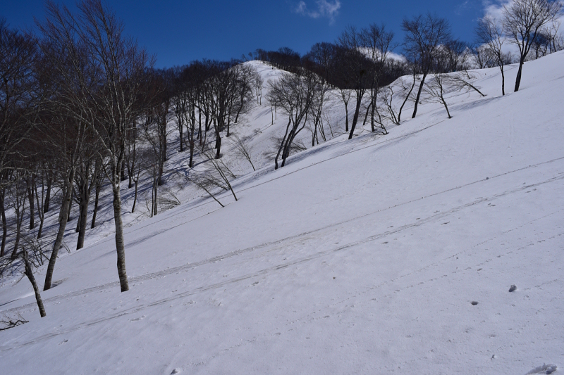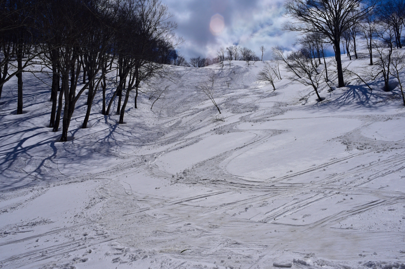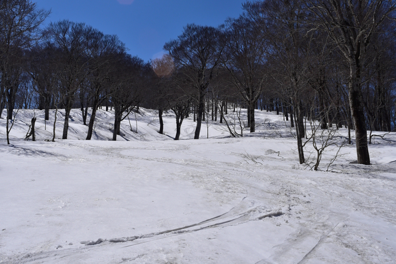 前日の雨は、山頂付近では雪だったようでシュプールがたくさんありました。