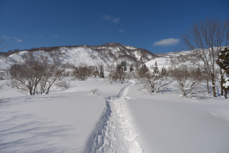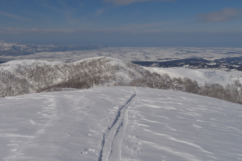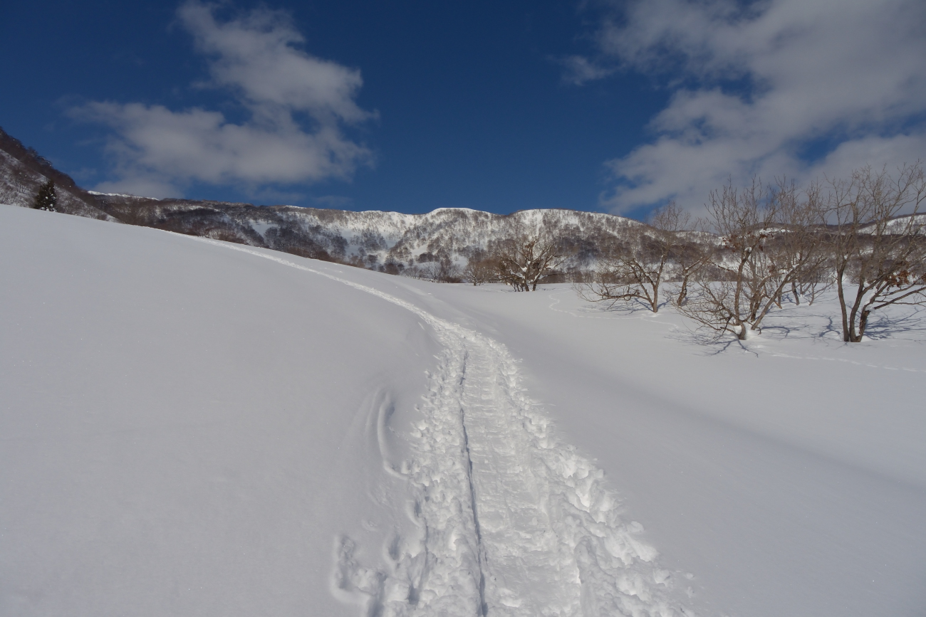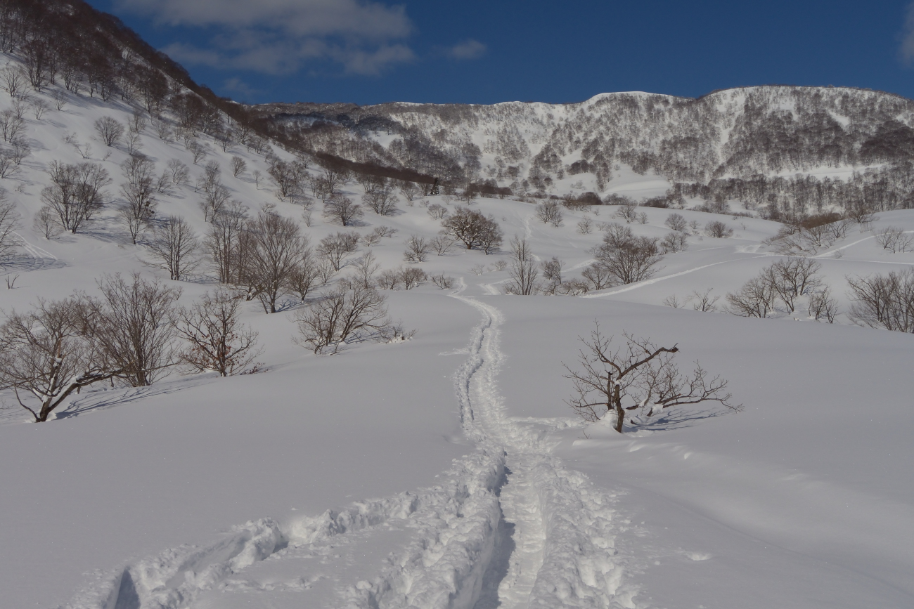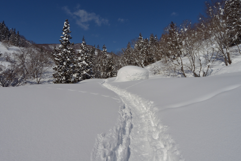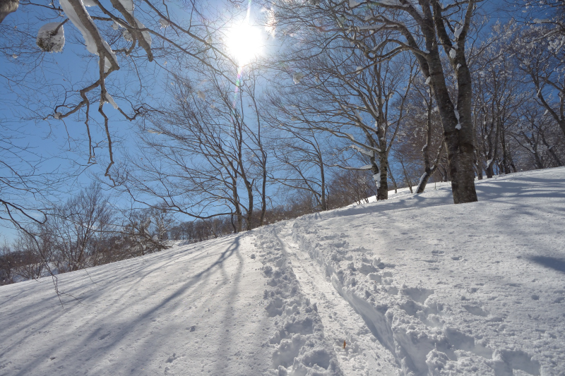 トレース利用させて頂き、のんびり出発。前日に50cmほど雪が積もり、気温も上昇してグサグサの雪質だった。転倒すると抜け出せない恐れがあったので慎重にくだってきた。 |