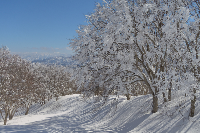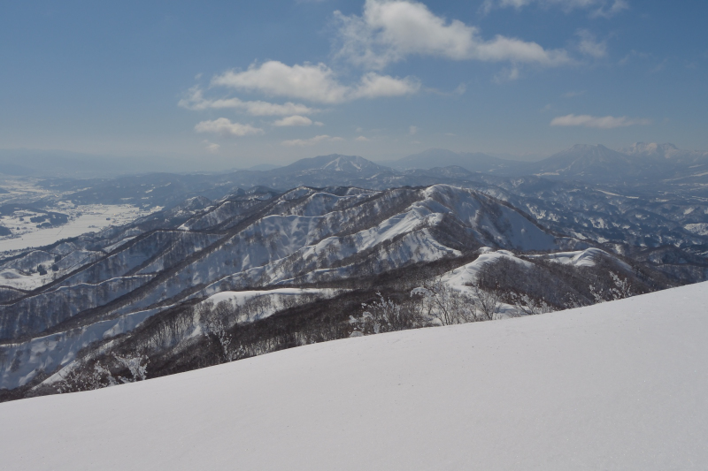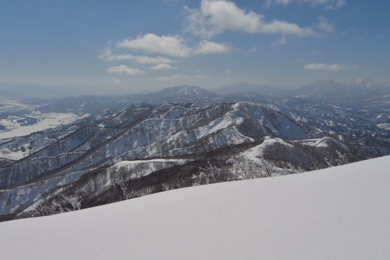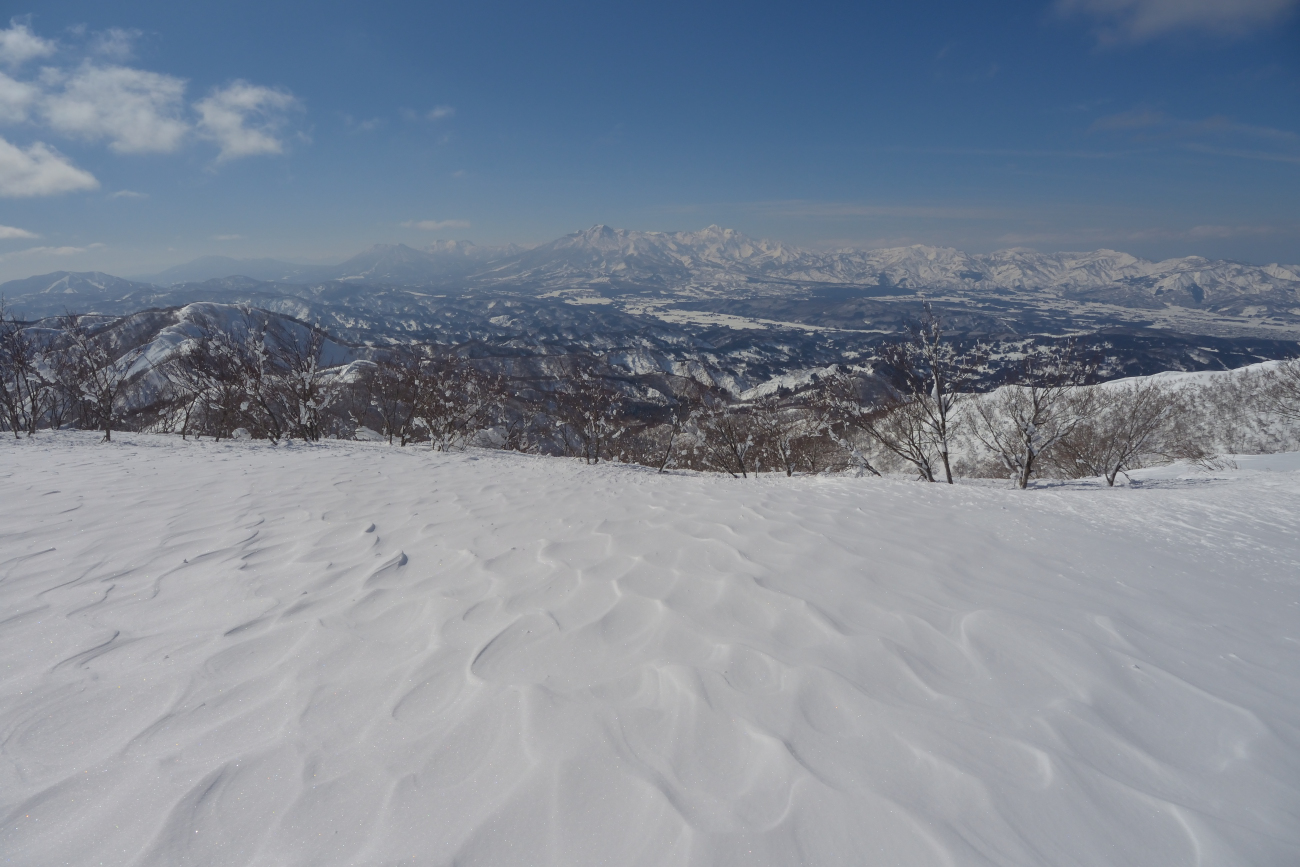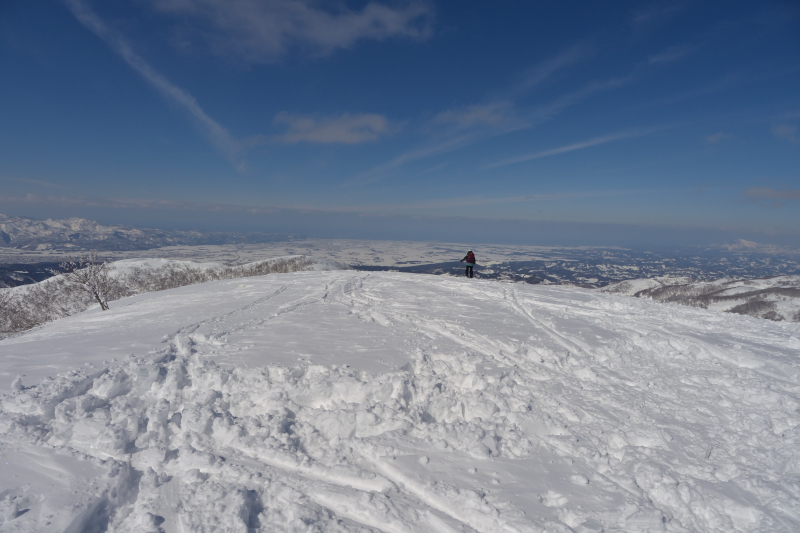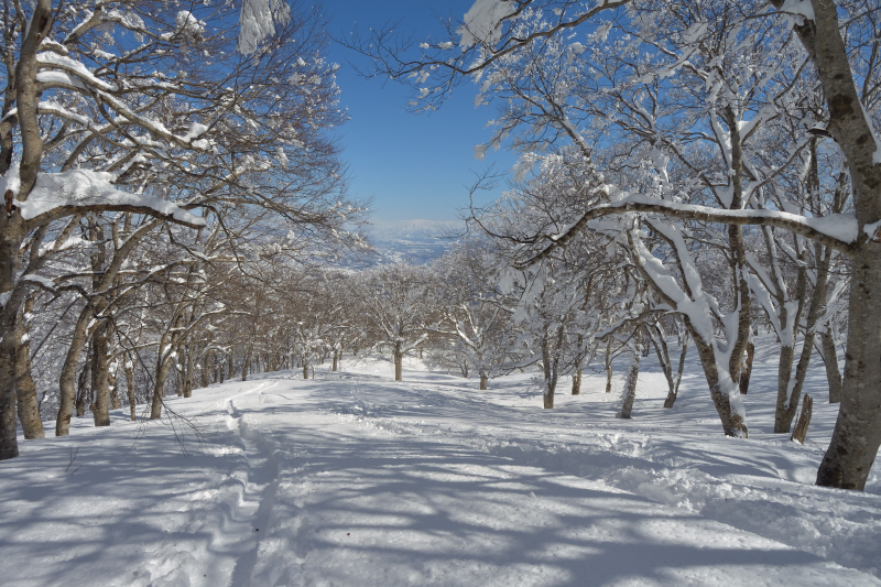 トレース利用させて頂き、のんびり出発。前日に50cmほど雪が積もり、気温も上昇してグサグサの雪質だった。転倒すると抜け出せない恐れがあったので慎重にくだってきた。 |