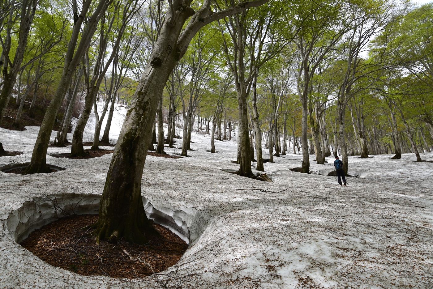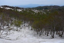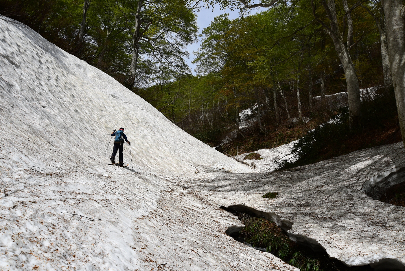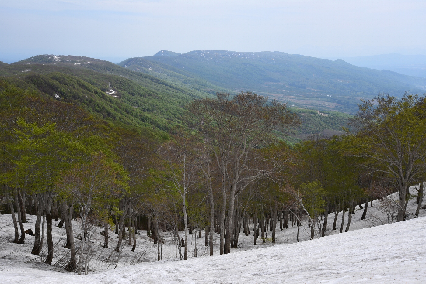 ブナの新緑を見る為に鍋倉山へ。残雪が少なすぎて快適に滑れる最後の週末となりました。
