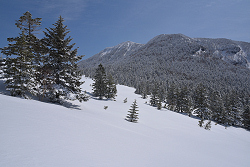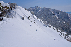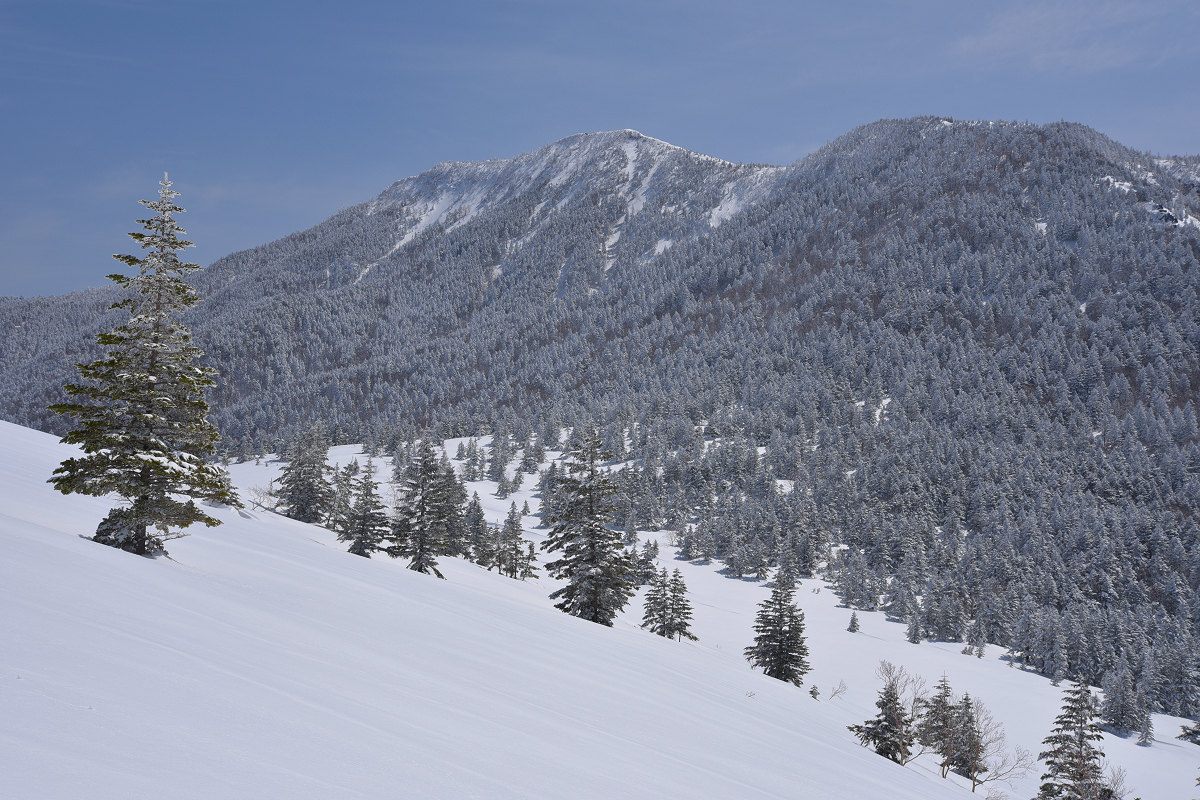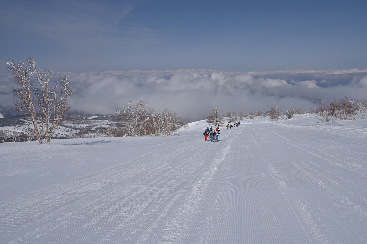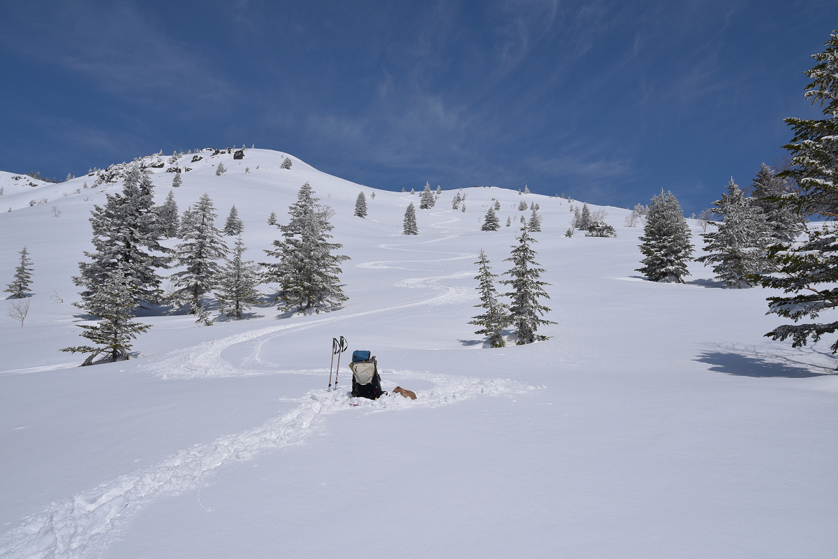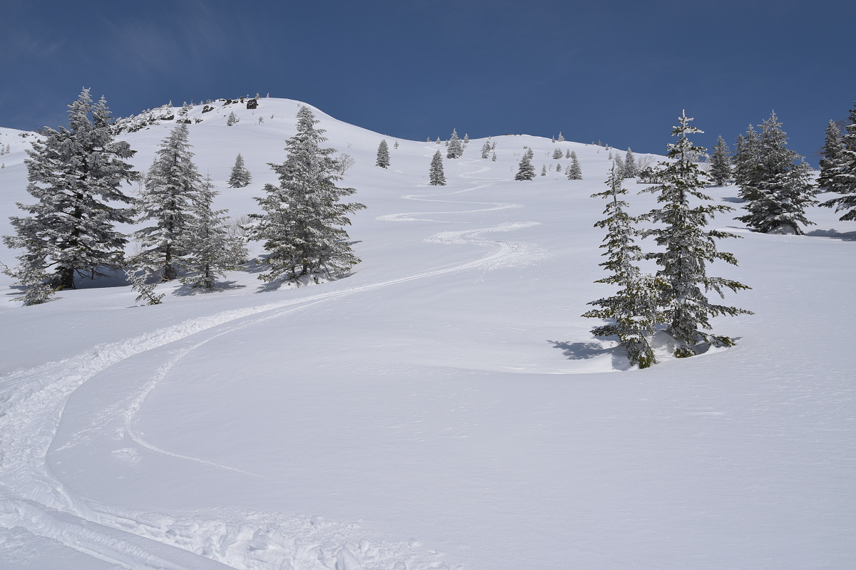 季節外れのめっちゃ軽い雪が降り、ツアーコースの脇に20〜30cmほど積もっていました。今シーズン最後の新雪になりそうだったので、根子岳の裏へ足を伸ばしました。