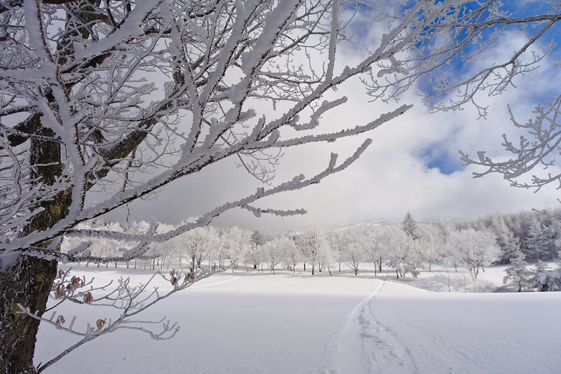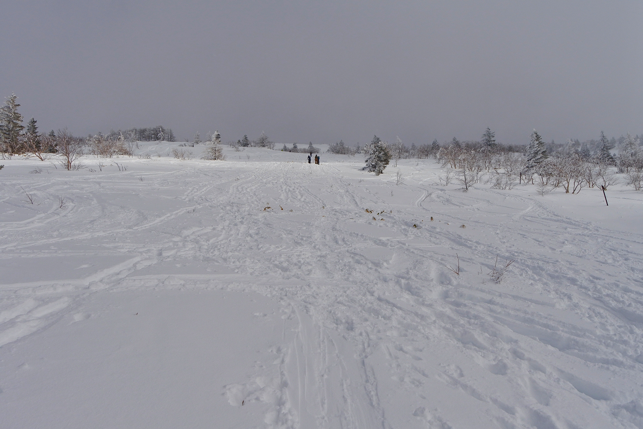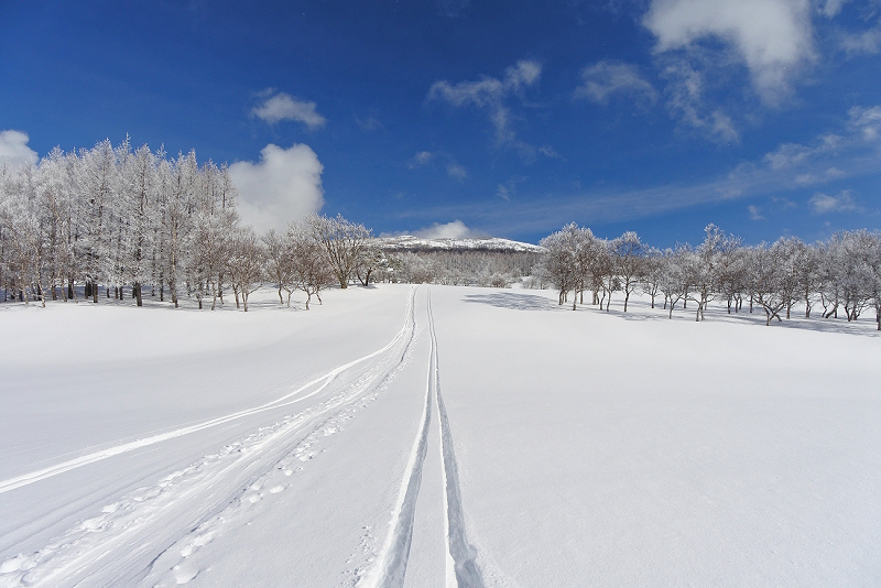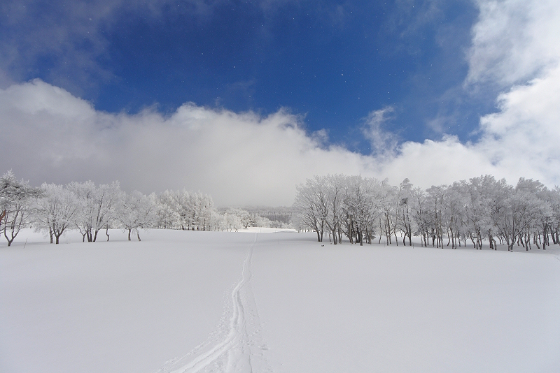 雪はサラサラです。休憩もそこそこに北側の斜面からゴルフ場に戻ります。