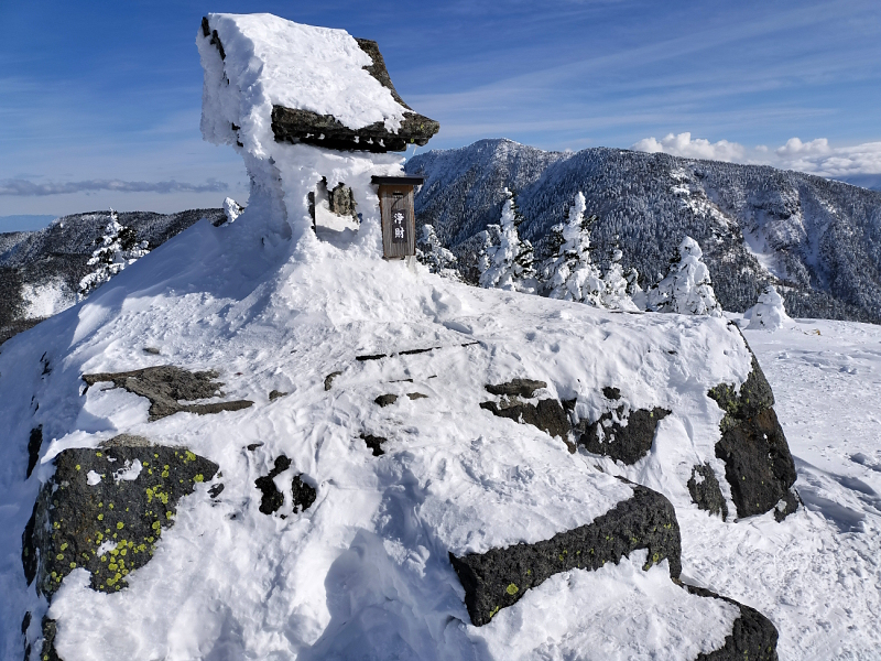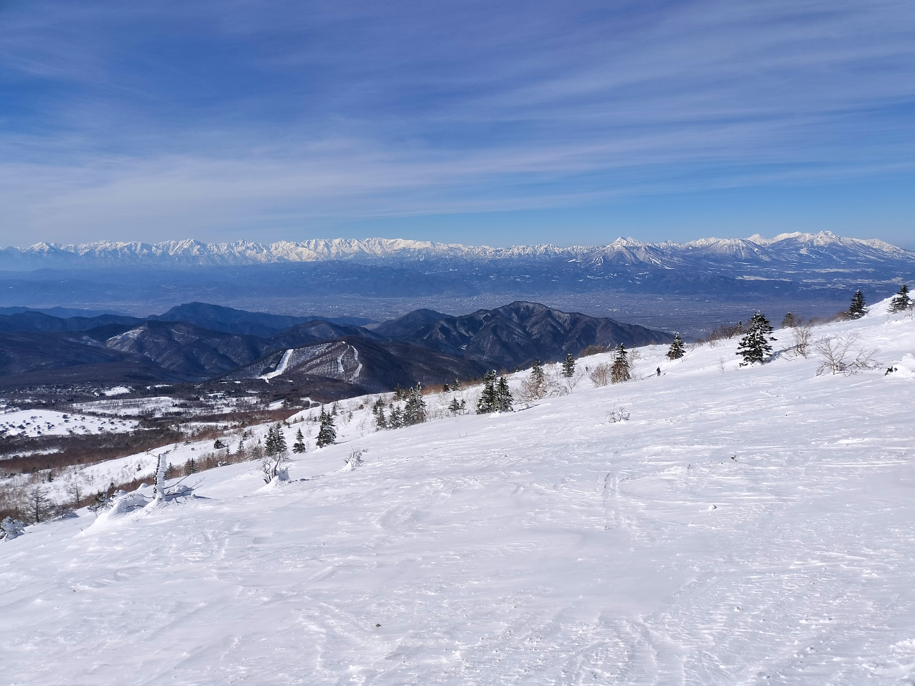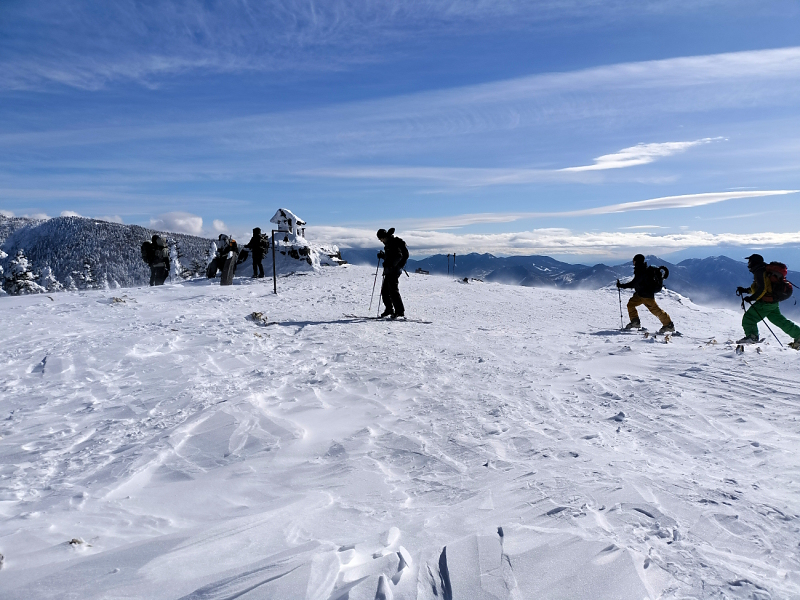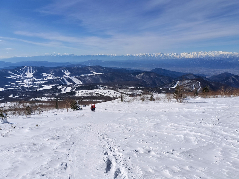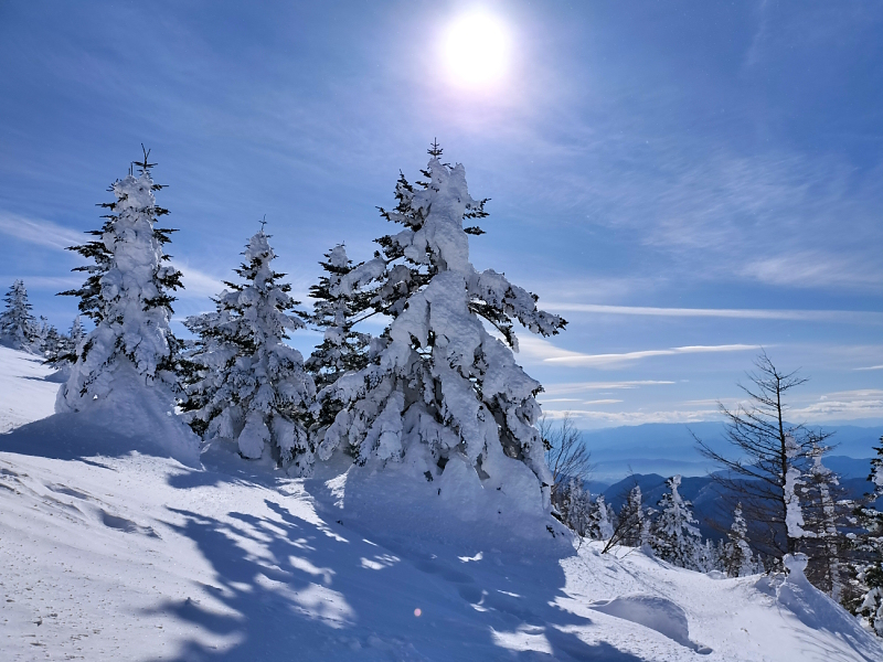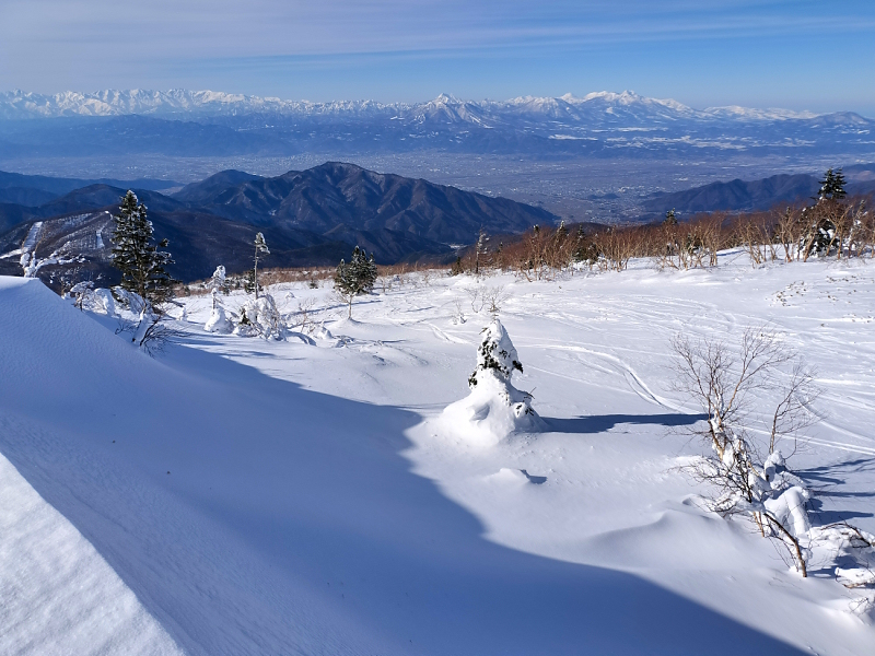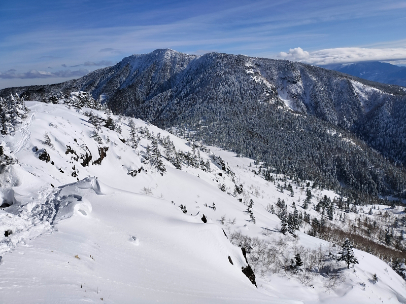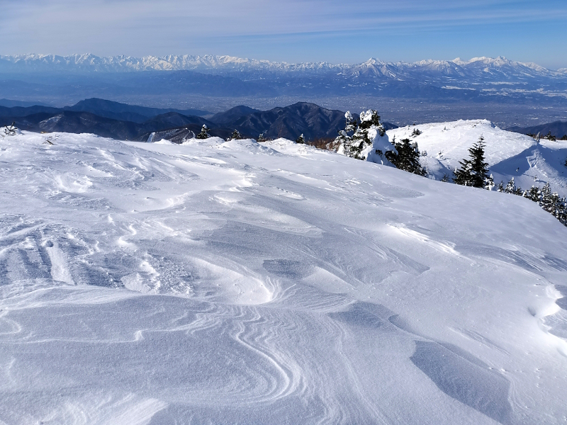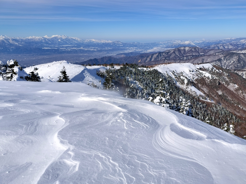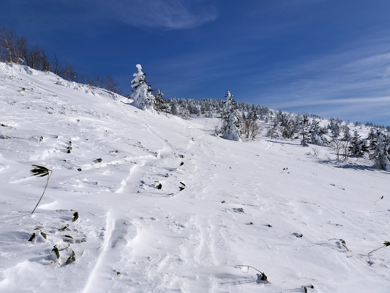 今日から気温が上昇するとの事で雪がベチャベチャになる前に山頂を目指しましたが、風が強く舞い上がる雪が頬に当たって厳しいコンディションでした。 |