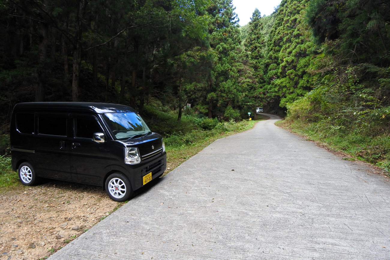 裏登山口に来ました。時間が遅いので停まっている車も少ないです。