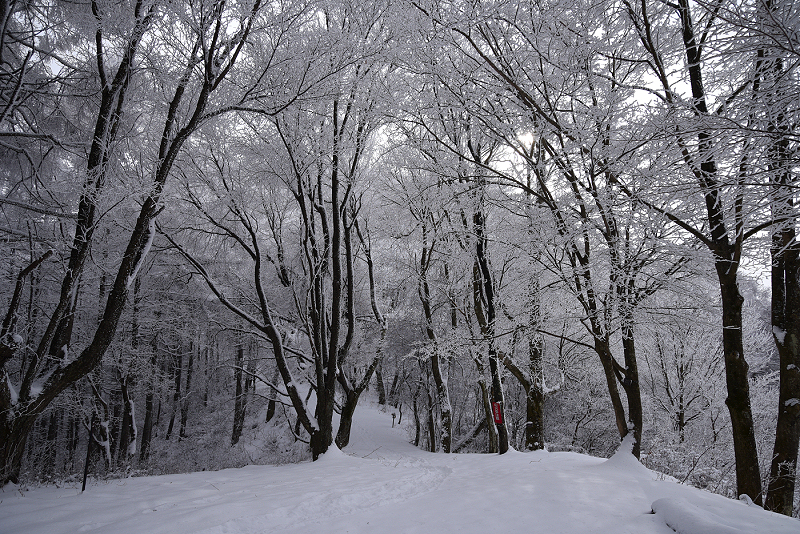 雪が降ったのでタイヤチェーンの練習を兼て太郎山に登る。 チェーンスパイクを履いて裏登山道を登るが、湿った雪のせいで靴の裏が団子になってしまい歩きにくかった。