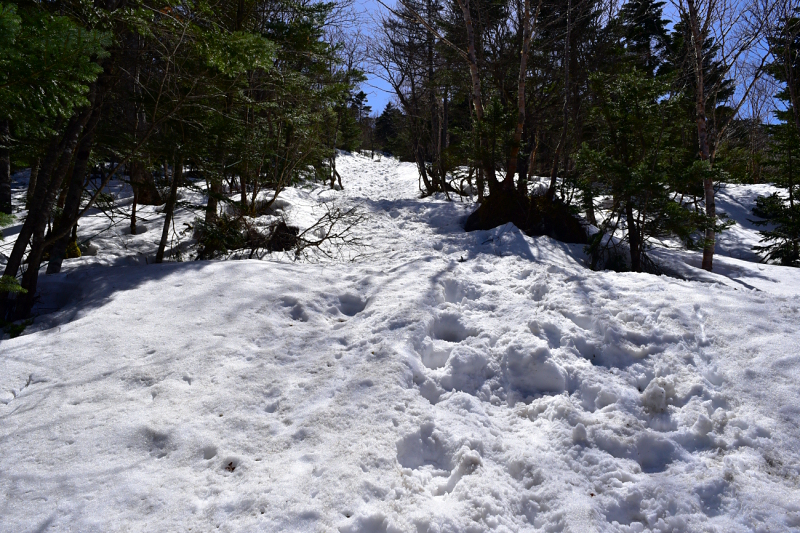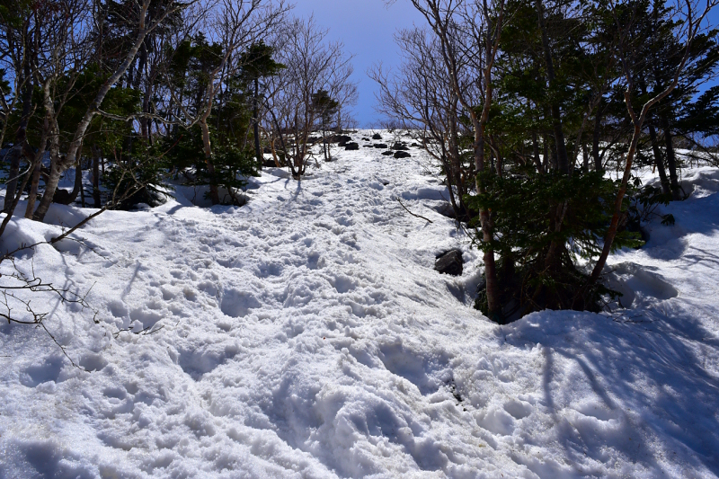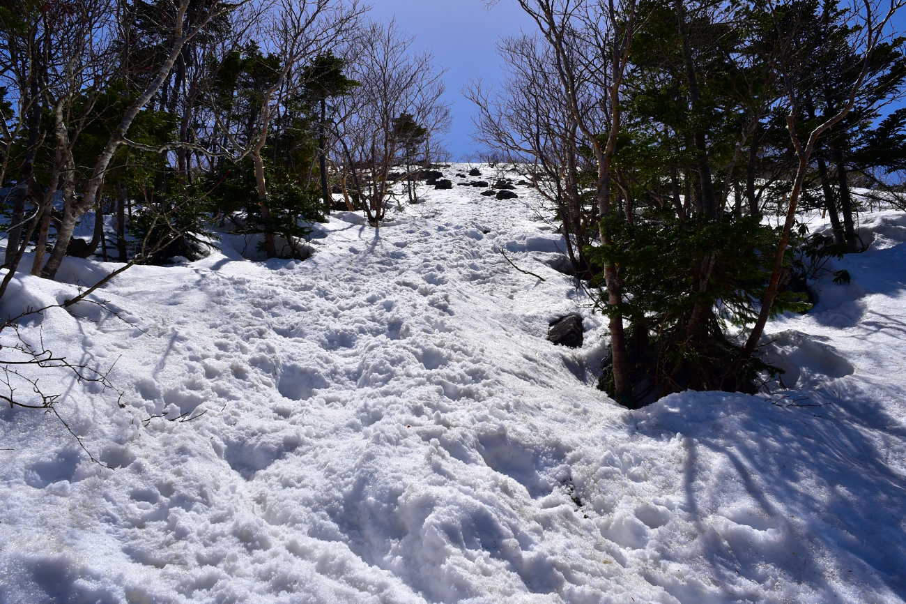 大勢の人達がチェーンアイゼンで下ってきましたが、雪が硬いと厳しい斜面です。