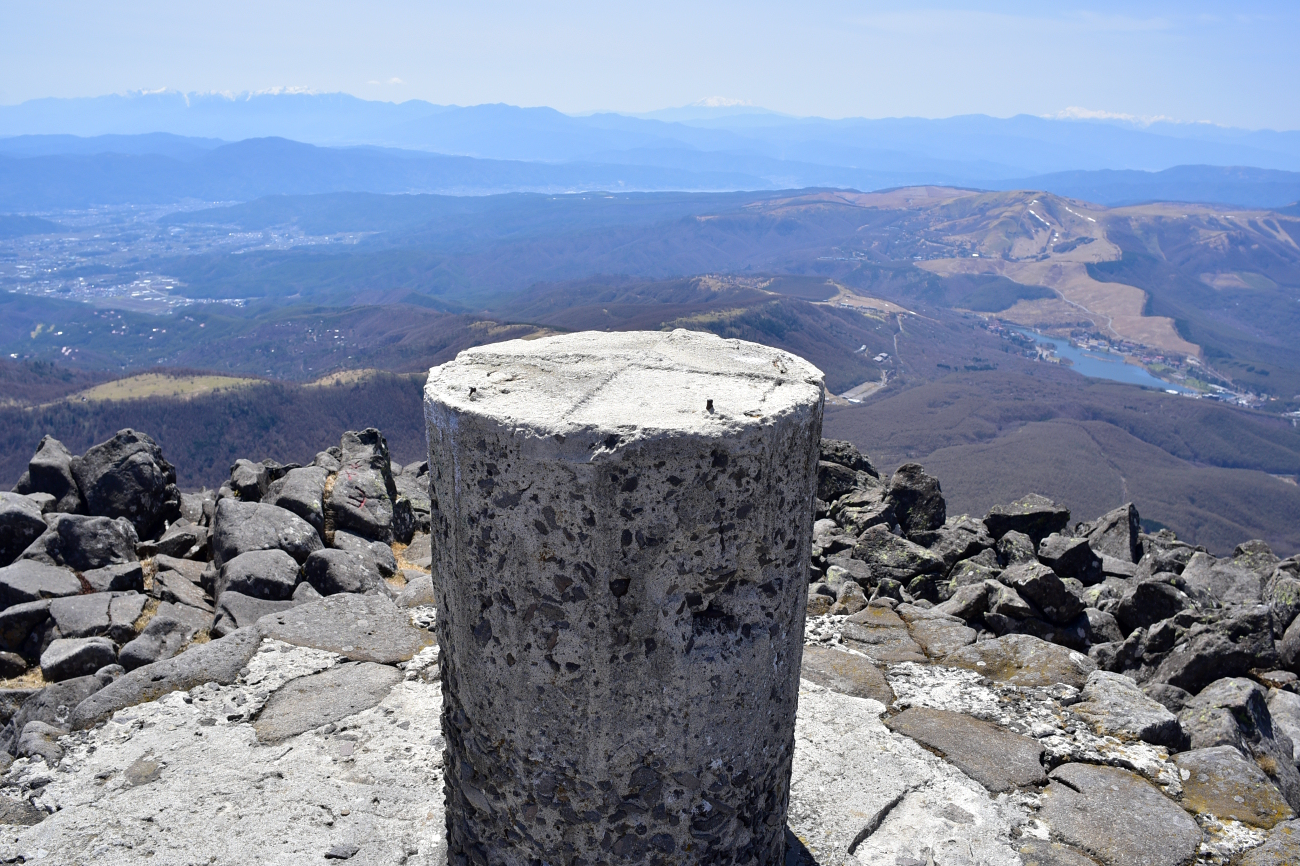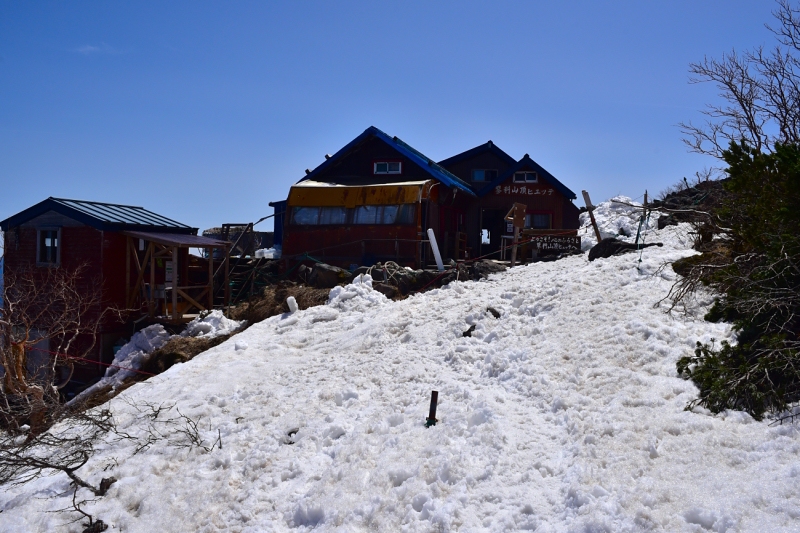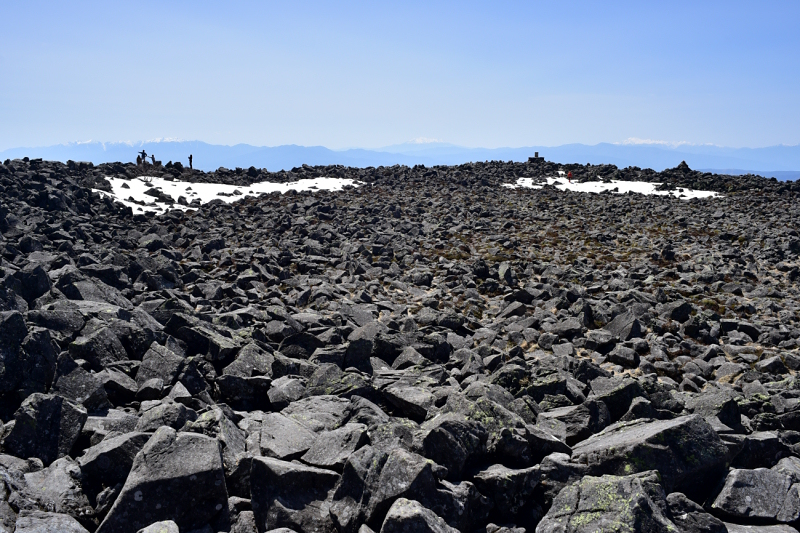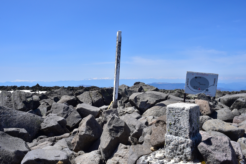 雪が溶けて踏み固められた登山道は、アイゼン無しでは歩きにくかった。頂上では、女乃神茶屋方面から登ってきた人達が大勢いたが、あちら側には雪が全く無かったようである。 |