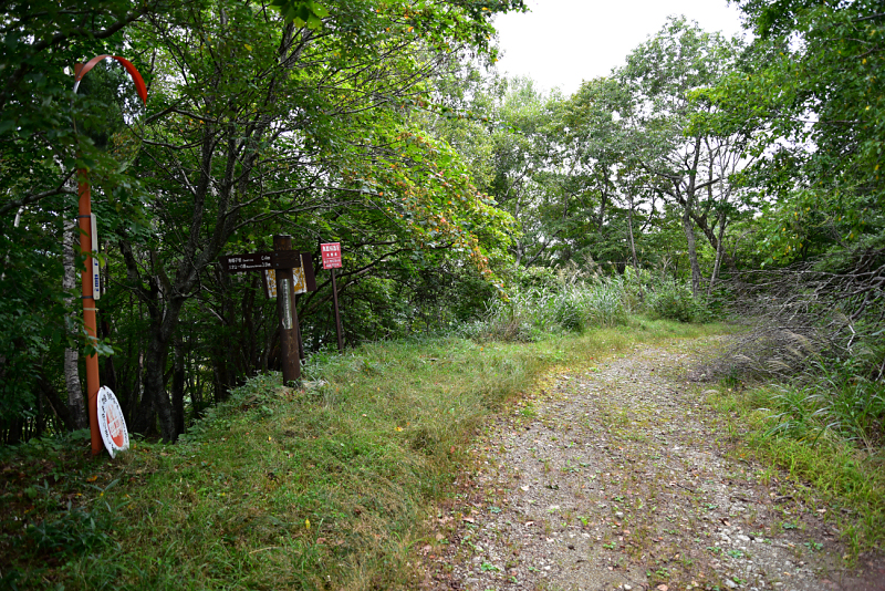 一ノ瀬のゲート前に車を停めて出発。右側のゲートを開けて進むと烏帽子岩の標識が現れる。