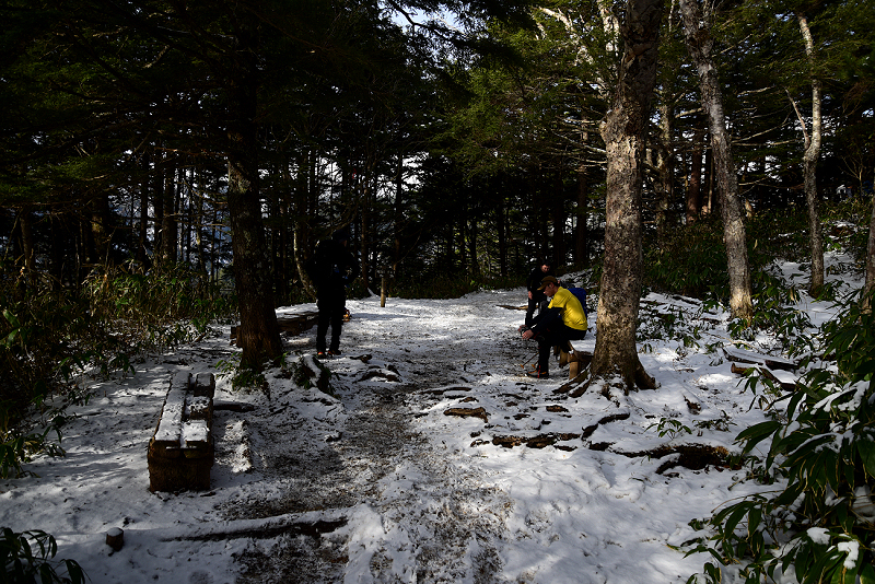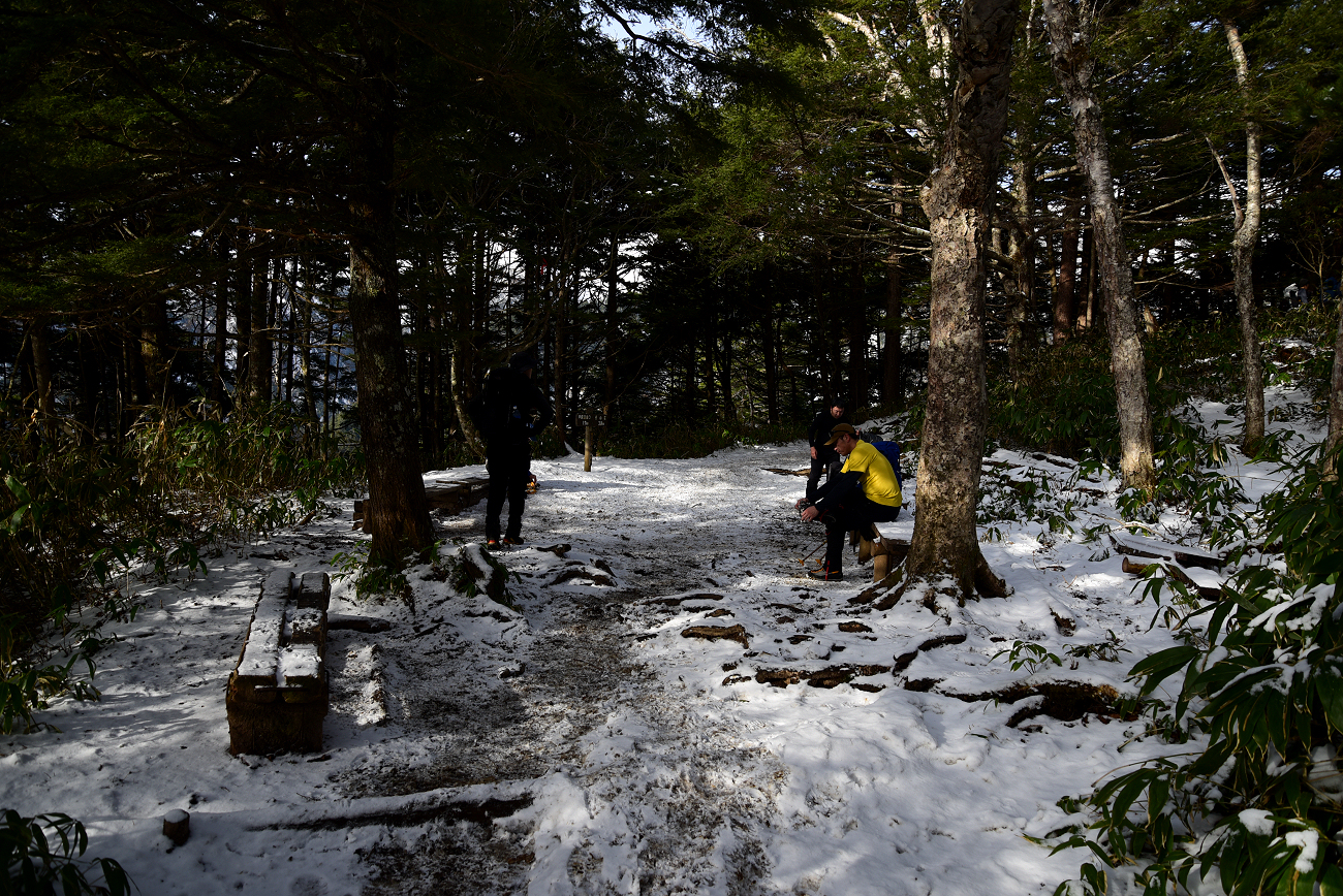 登山道の一部が凍っていたので、第2ベンチでチェーンアイゼンを装着しました。