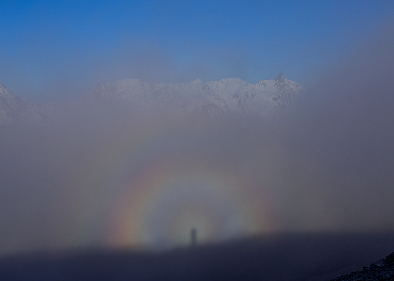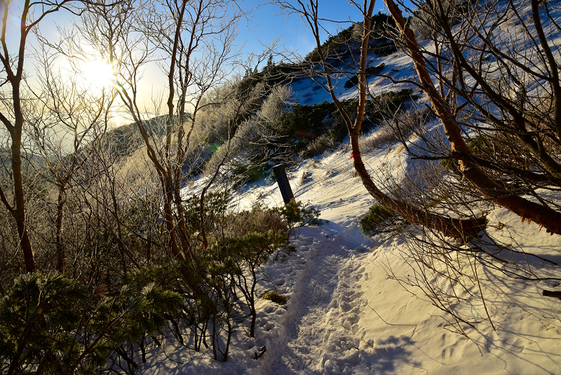 早めに出発して明るくなった頃に蝶ヶ岳に到着するように三股を出発した。凍結した登山道には謎の血痕があり、ちょっとビビる。