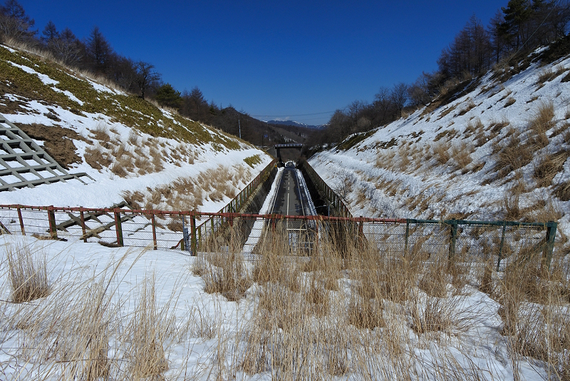 先週の三峰山が良かった為、2週連続で同じ地域にやってきたが、雪が少なく三峰山を諦めて旧和田峠スキー場で遊ぶ。旧和田トンネルには説明の看板があり、歴史を感じながら歩く事が出来た。 |