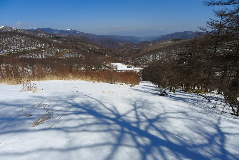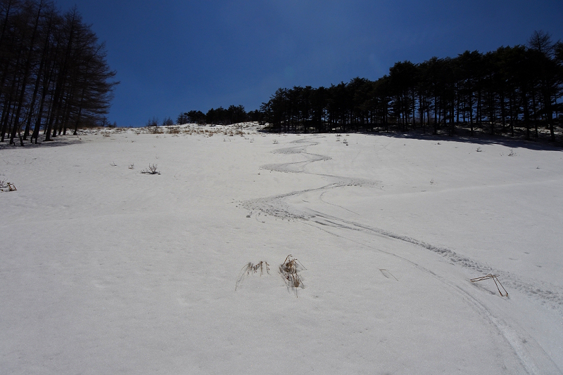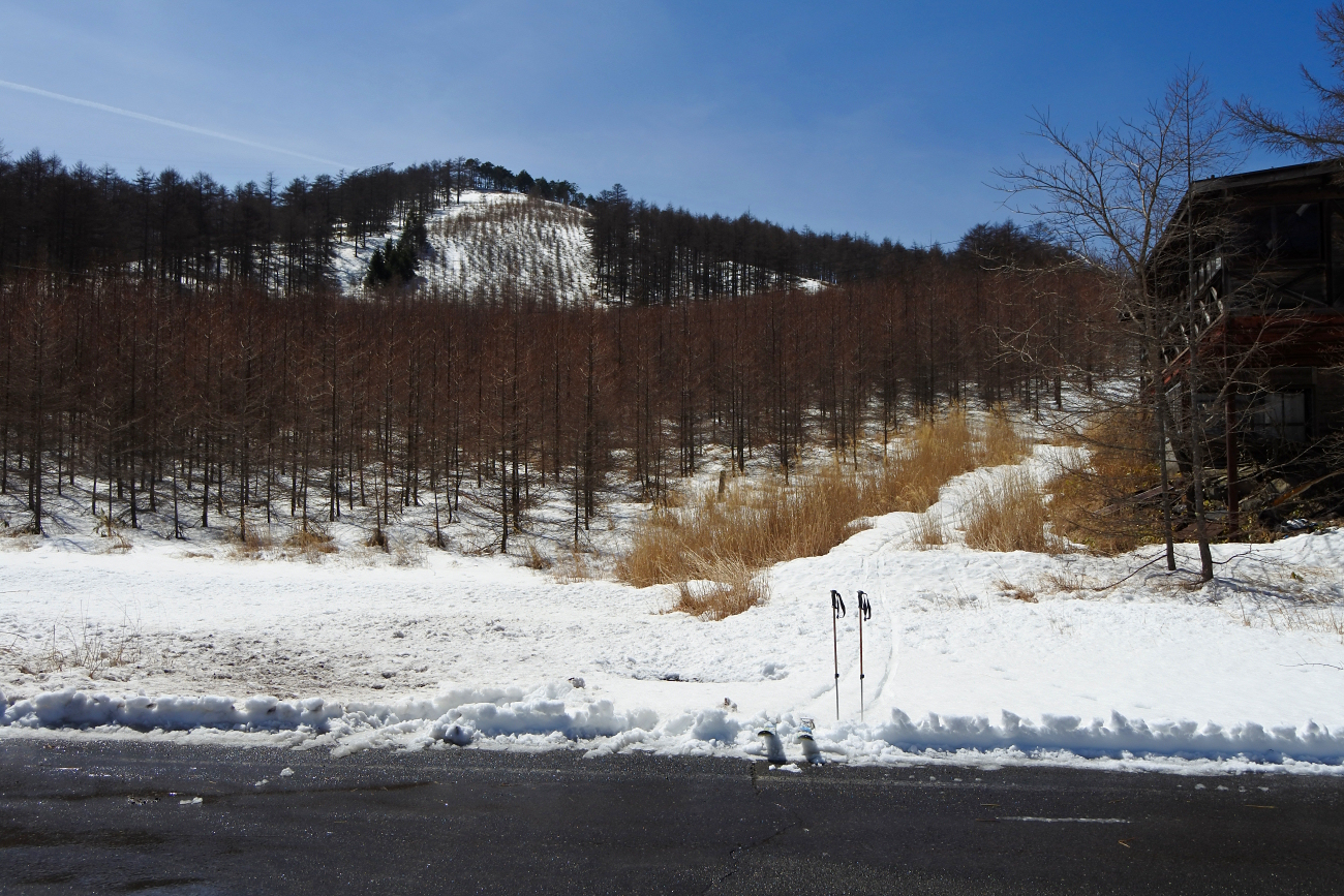 旧和田峠スキー場に到着。森の中は雪が多くて滑るには困らなそうだけど、三峰山方面は溶けてしまい先週の面影は無し。