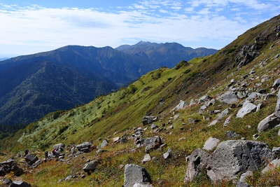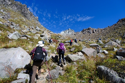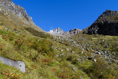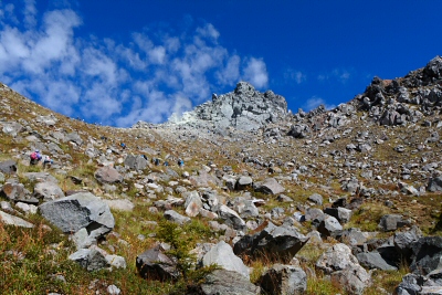 山頂は大勢の人達で賑わっていた。山頂直下の登山道は、すれ違い困難な為、分岐まで下山するのに45分ほど掛かってしまった。 |