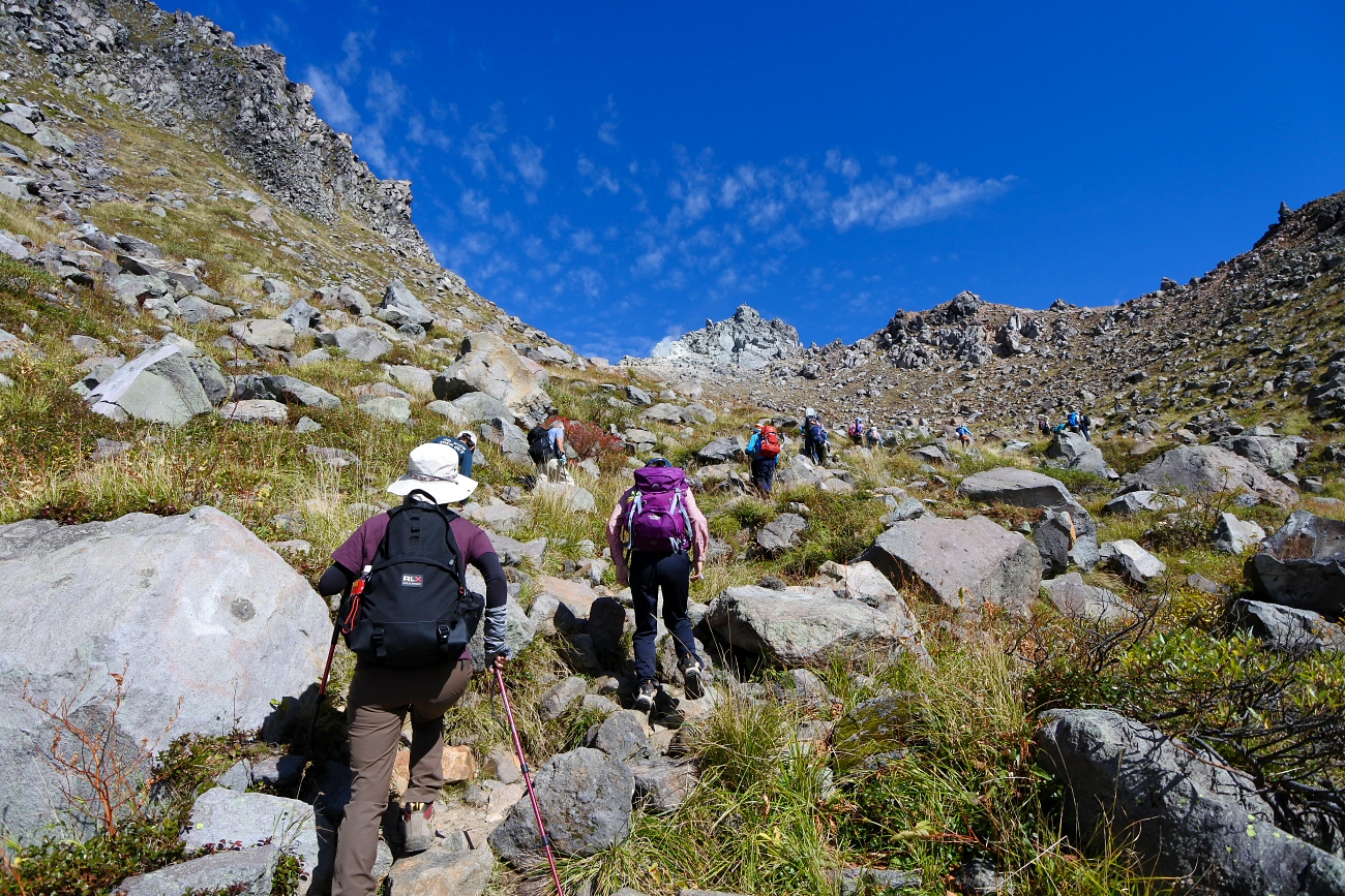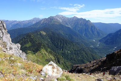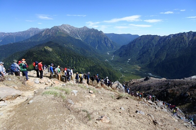 登りで渋滞中。穂高を見ながら10分ほど待ちました。 |