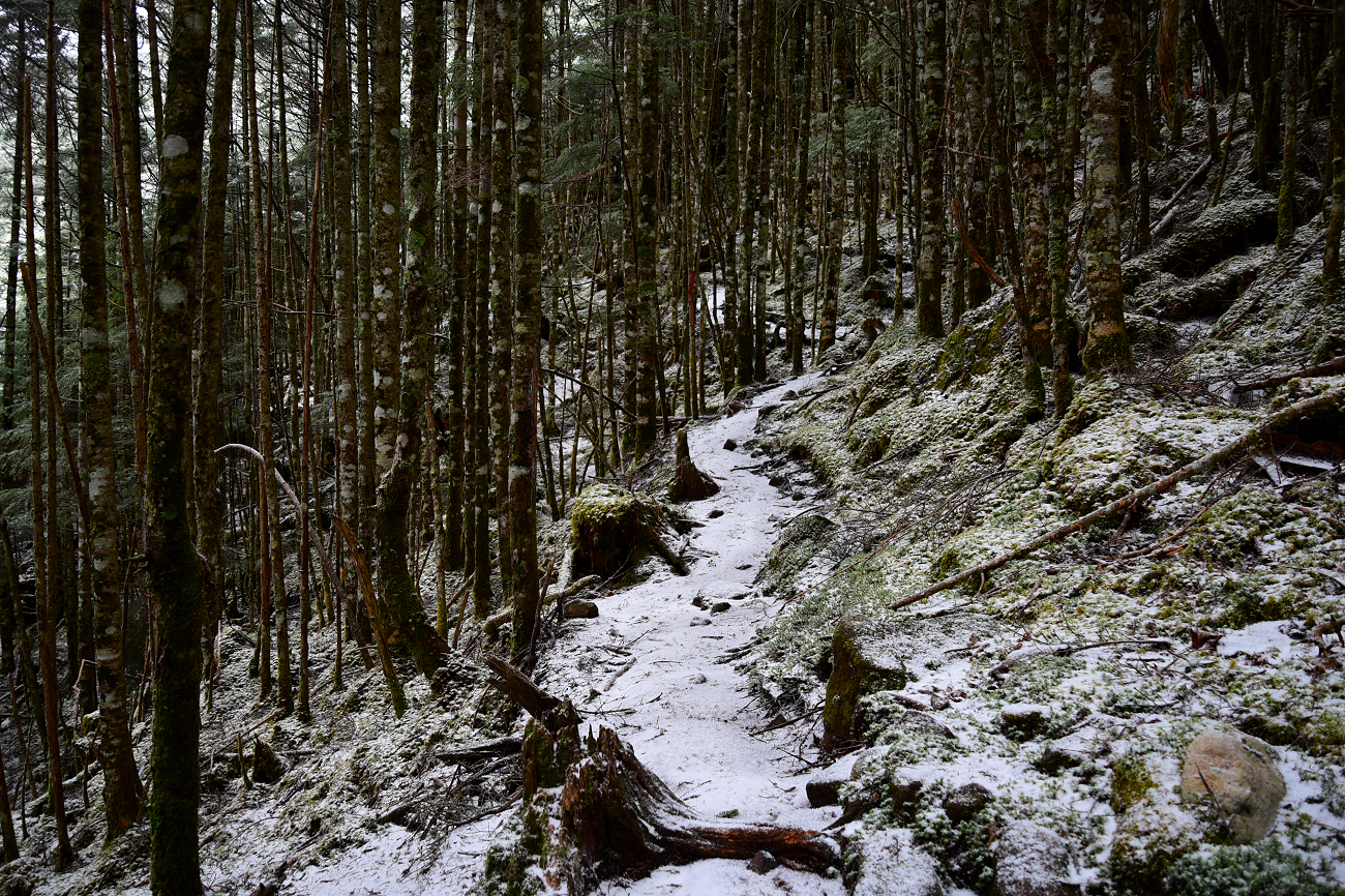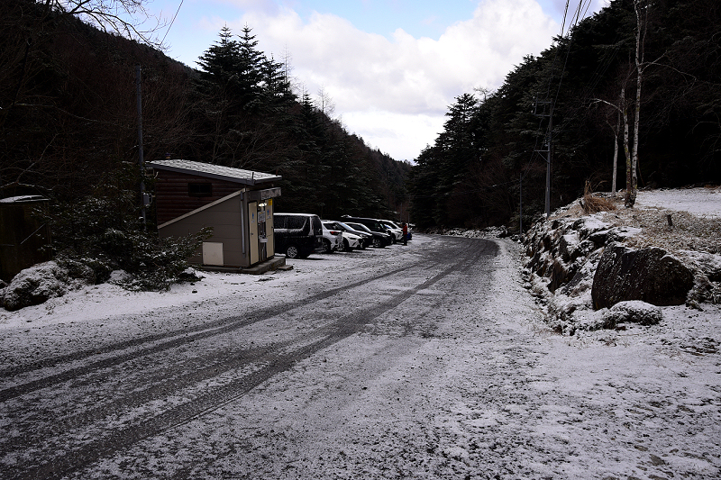 凍った雪の上に薄っすら積もってます。チェーンアイゼンを装着して登っていきます。