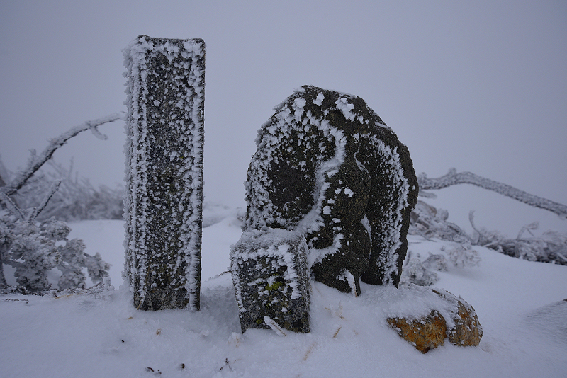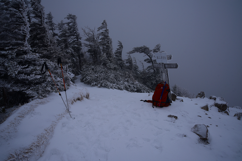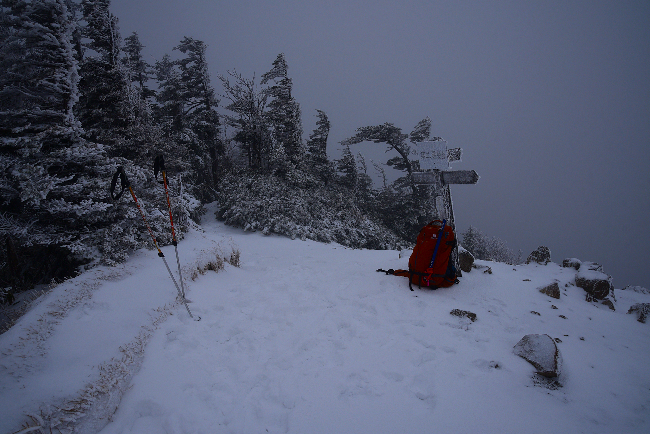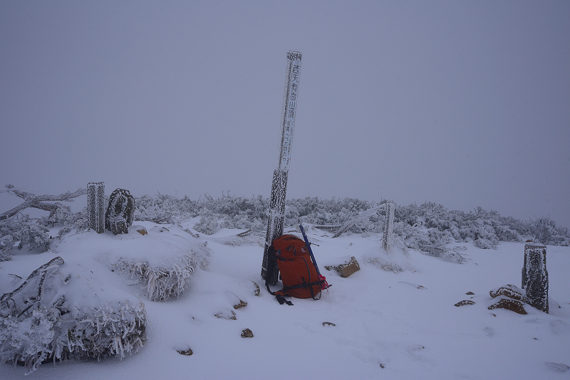 疑似天候の青空を狙って八ヶ岳の天狗岳へ。出発した時は、青空も見えていたが、次第に天候が悪化して山頂に到着する頃には猛吹雪になっていた。 |