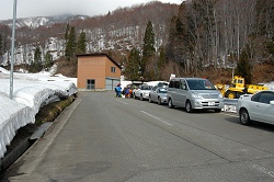 高速道路を飛ばして温井地区までやってきたけど、それほど人が多くない。今日は天気が下り坂なので訪れる人も少ないのか?前回来た時よりも、だいぶ雪が少なくなっていた。