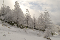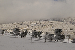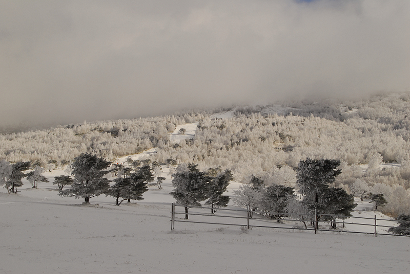 奥ダボススキー場が近づいてくるにしたがって木々の純白度合が増してきた。