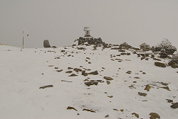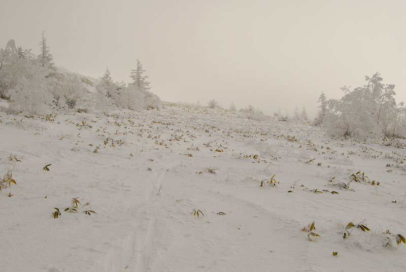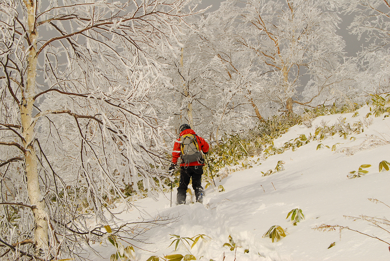 スノーシューの団体が居るようで、しっかりしたトレースが出来上がっていた。深い所では20cmほどの新雪あるようだけど、まだ笹が見えているので滑るには怖い状況である。
