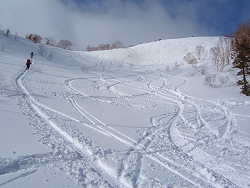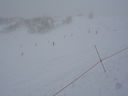 ここのスキー場は緩斜面が多いので、効率良く激重のパウダーを頂いてから鳥居尾根のリフトに移動する。 まだ誰も滑ってないコースは浮遊感があって楽しいけど、ゴーグルに湿った雪が張り付いて前が良く見えない。それでもノンストップでカッ飛ばし、フラットな部分が無くなった所でカモシカゲレンデに移動する。