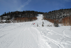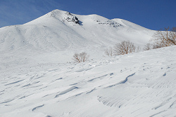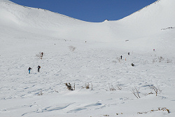 肩の小屋に戻って大雪渓を下り始めるが、シュカブラとアイスバーンで滑りにくい。森林限界までやってくると、今度は大勢の人達が滑った跡で楽しめる状態では無かった。 |