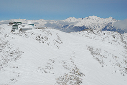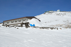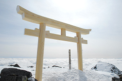 いつの間にか山頂には鳥居が出来ていて、風が避けられる場所で雲海を眺めながらパンを食べるが、やっぱり高い山は気温が低くてて見晴らしも素晴らしい。久しぶりに3000mを超える山に登ったが、何だか雪が少なくて穂高方面はパッとしない状態だった。