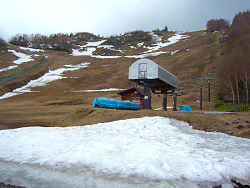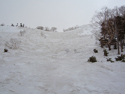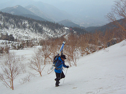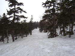 最初は硬かった雪も、だんだんと柔らかくなって滑りやすい。 楽しく滑ってゲレンデの上部にやってきた。しかし、ゲレンデ上部で雪が途切れてしまい、スキーを背負って慎重にゲレンデを下ってきた。