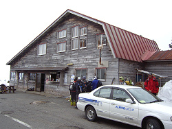 トイレの建物に大勢の人達が集合している。強風とガスで皆さんの足取りも重い。おまけに斜面がカリカリなので無理して登っても面白くなさそうだ。