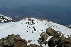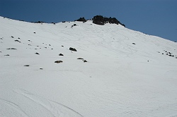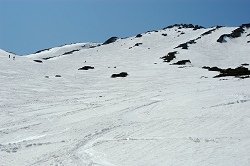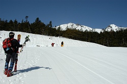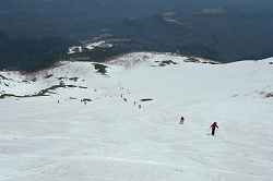 山頂でのんびりしてから下山ルートを探る。 シュプールの様子だと、一の池に滑り込んでから二の池方面に行くらしいが、登ってきたルートはアイスバーンもあって大変だ。転倒したら、滑落しそうで怖い。