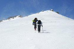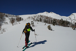 アイスバーンになっている斜面でアイゼンやピッケルの練習をしながらスキーをデポした場所まで戻る。急いで下山してしまうのは勿体無いが、気温が下がって樹林帯でモナカになってしまうとやっかいなので、アイスバーンに気を付けながら慎重に滑り出す。