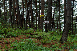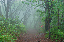 本日はガスで周囲の様子は分からないけど、大峰山には新しい標識が設置してあり、地図に載っていない水晶山の表示もある。予定では、その先へ進むつもりは無かったけど、それほど遠い距離ではないので、どんな場所か偵察に出かける事にした。