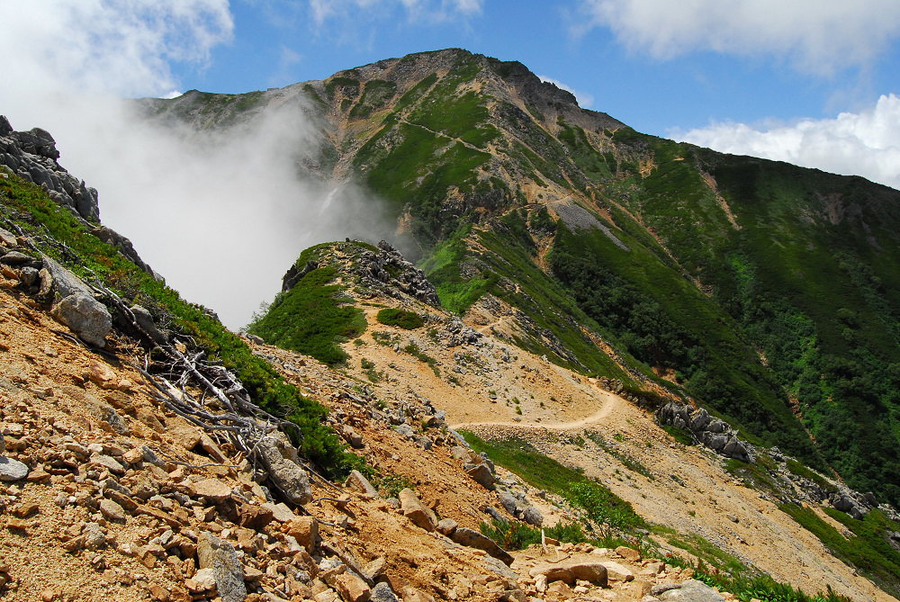 久しぶりにテントを背負ったので燕山荘までの上りがキツイ。時間もたっぷりあるので、のんびり稜線歩きを楽しむが、大天井岳が見えてくると青空も広がり始めて期待も高まる。