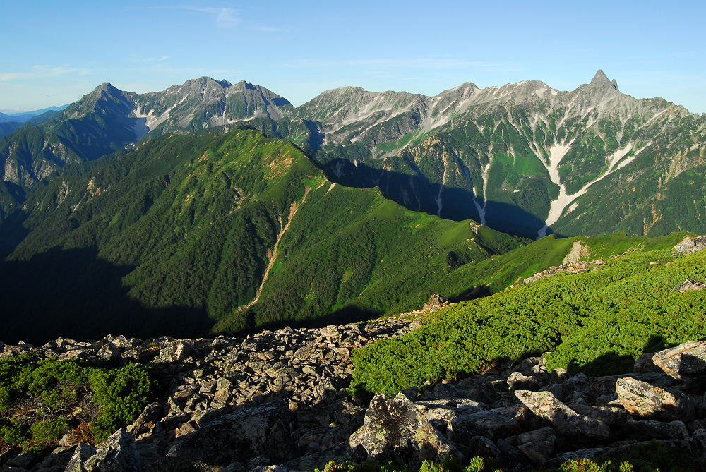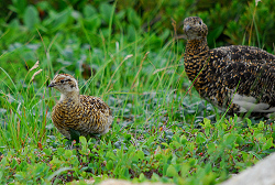 大天井岳直下で雷鳥の親子と遭遇する。以前と比べてだいぶ数が減ったような気もするが、本当のところどうなんだろう?