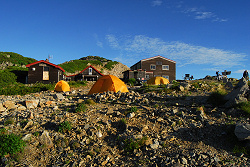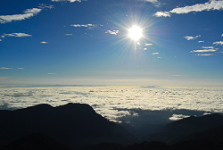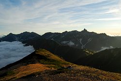 翌朝は風が強くて岩陰に隠れながら太陽が出てくるのを待つが、目の前には見事な雲海が広がっていて秋の装いを感じさせる。天気が良かったので西岳方面に行こうか迷ったけど、帰りの事を考えると大変そうだったので、また今度って事で中房温泉へ下山する事にした。