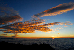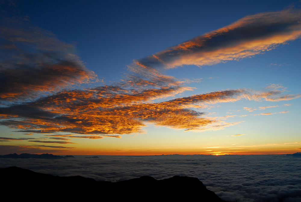 大天荘でテントの受付を済ませ、そのまま夕方まで昼寝をする。夕陽の時間になると槍も見えて綺麗な雲海が広がり始めた。