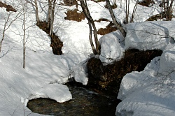 氷沢出合に到着してから、沢を歩くか、トラバースルートにするか迷ったけど、何度もスノーブリッチを渡らなければならないので、来た道を戻る事にする。
