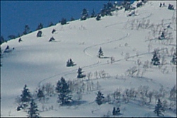 今日は急斜面が続くようなのでブリックエネミーで出動する。ちょっと重いが、山スキーのように歩けるので快適だ。シールを装着して山の中へ消えるが、急斜面が続き苦労する。