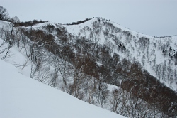 しばらくラッセルを続けてるとトレースがあった。どうやら、もう少し林道を進んでから尾根に取り付くようだ。ほとんど直登ぎみに登っているトレースは、気を抜くとズルズル後退してしまう。頑張って踏ん張り、雪屁が見えてくると頂上も近い。 雪屁が崩壊していたので、トレースを外して雪屁に気をつけながら進む。