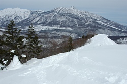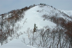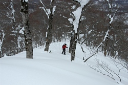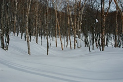 パウダーガイドに紹介されてたルートを滑る予定だったが、紹介されて場所は急斜面で藪っぽい。ちょっと戻って快適そうな場所から滑り出すも、だいぶ高度を下げてしまったようだ。 南向きの斜面の為、かなり重いパウダーである。重心を落として慎重にターンしてると平坦な場所に到着した。