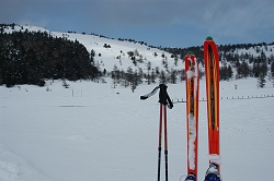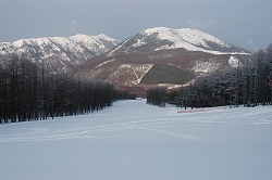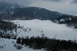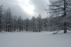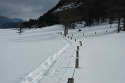 湯の丸高原と高峰高原の中間地点にある池の平湿原は、冬の散策コースとして人気が高く、標高2000mの雪質は北海道なみのパウダースノーらしい。サラサラの雪は、テレマークスキーで遊ぶに具合が良く、まだまだレベルが低い自分にとって転がり落ちるのに好都合だった。 |