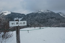 林道をショートカットをして急な斜面をキックターンで上っていくと村界の丘に到着した。天気が悪くて眺めもイマイチ。晴れてれば目の前の篭の登山などカッコよく見えるのに、ちょっと残念だ。 |