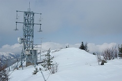 見晴岳には上田ケーブルビジョンのアンテナがある。ここから見る烏帽子岳は、スキー場から見た景色と微妙に違う。とっても凛々しい感じってことでコメント終了。ここから三方ヶ峰方向は緩やかな下りとなるがシールを外すのは面倒である。急な斜面をプルークボーゲン下って、とっても恥ずかしいシュプールを描く。
