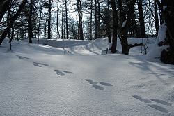 三方ヶ峰に行く途中、まだ新しいウサギの足跡を発見した。今までたくさんの足跡を見てきたが、雪の上を歩いてるウサギを見たことがない。真っ白になって保護色となったウサギは見つけるのも大変なんだろう。