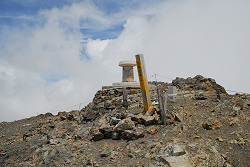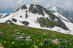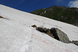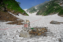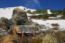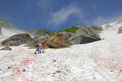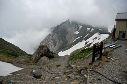 小雪渓を通過するのにアイゼンが必要かと思っていたら、しっかりルートが作ってあって難なく登っていく。この先には避難小屋があるので、そこで休憩するつもりが、それらしき建物が見当たらない。近くまで行ってみると雪崩ですっ飛んでしまったようだ。