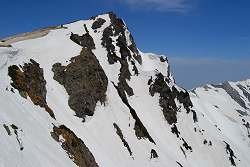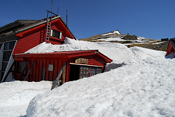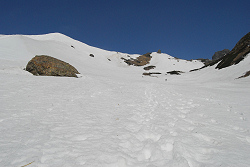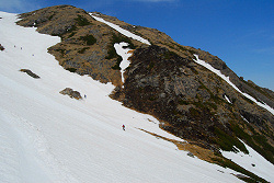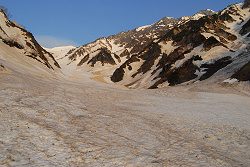 猿倉の駐車場でスキーを背負って出発する。やけに気温が高くて生暖かい風が吹き抜ける。長走りを過ぎた辺りでスキーを装着して白馬尻にやってきたけど、いつもよりも雪が少なくて地肌がクッキリしていた。